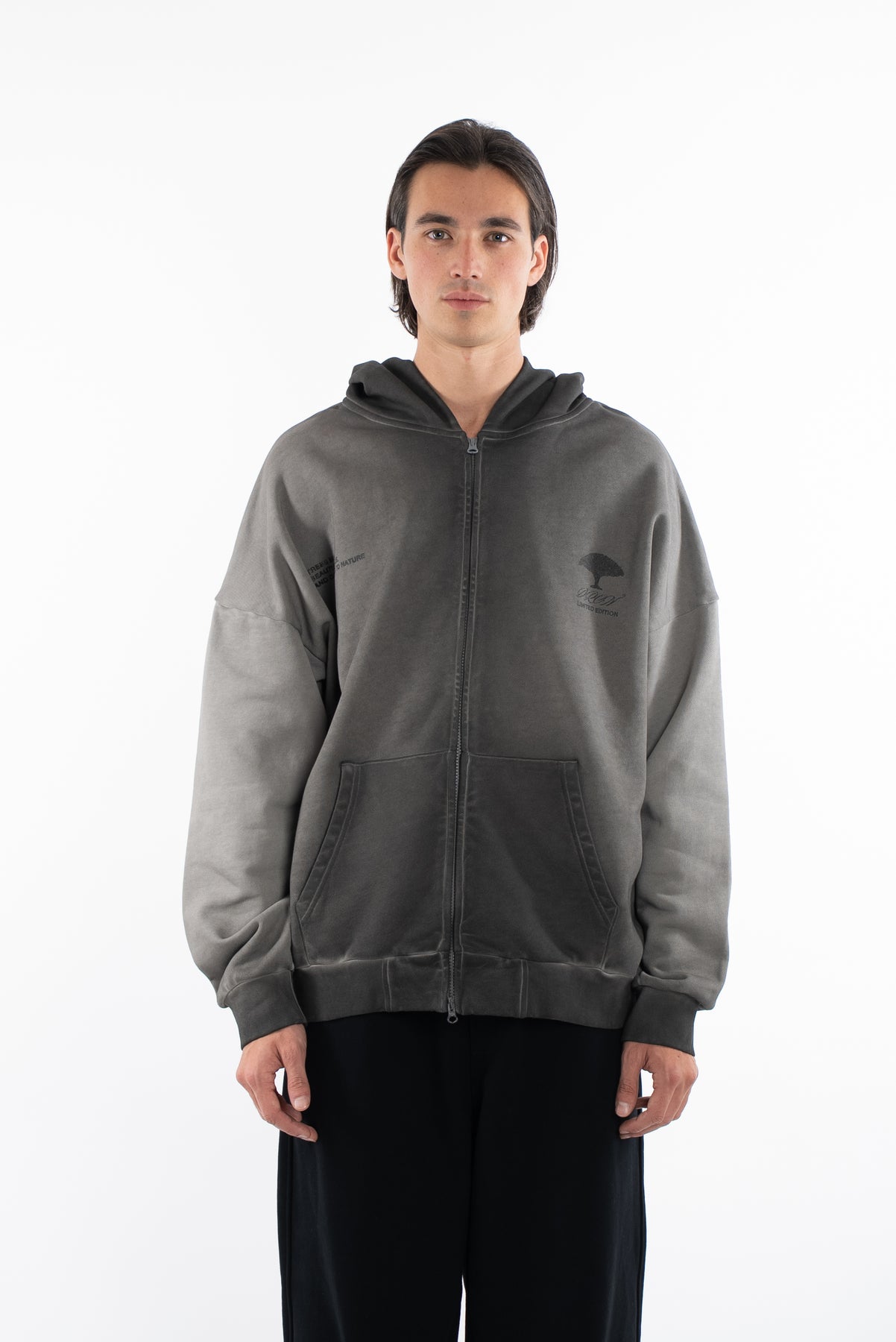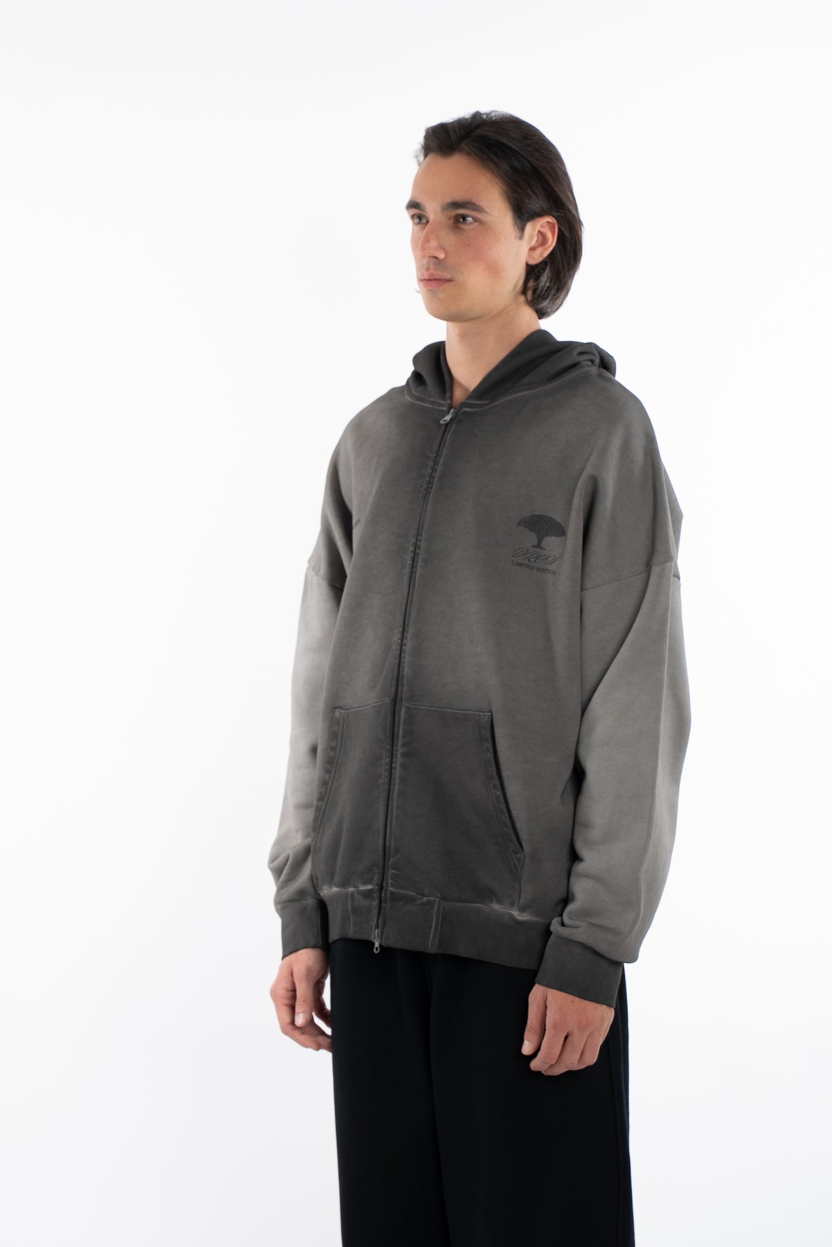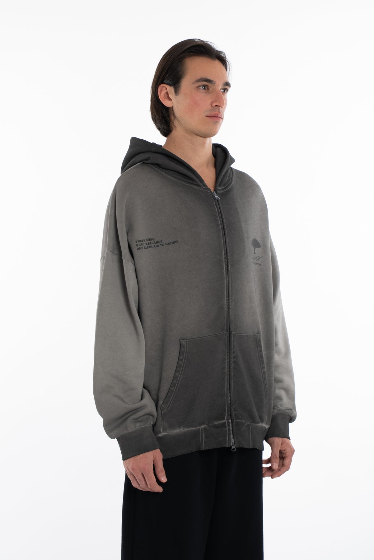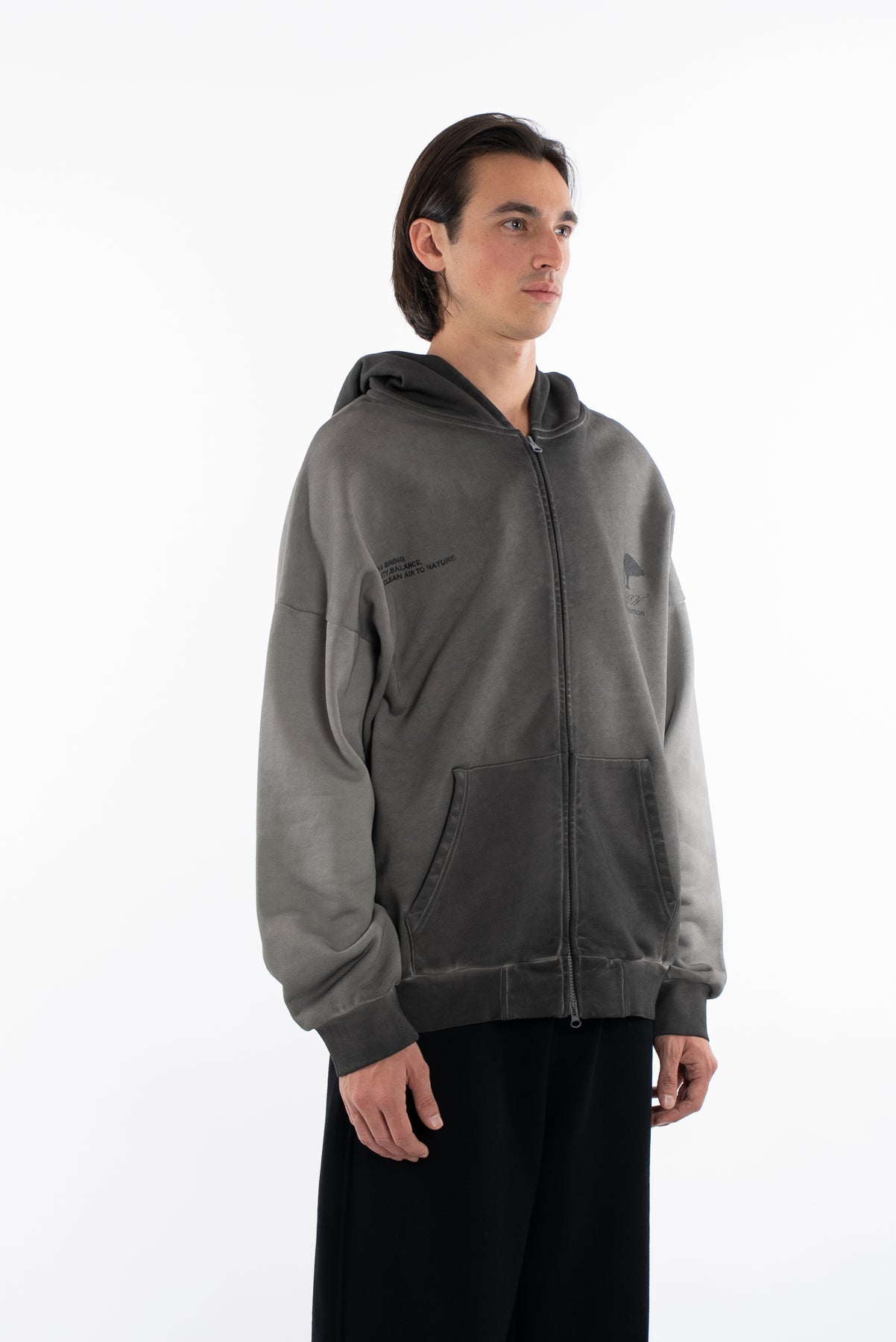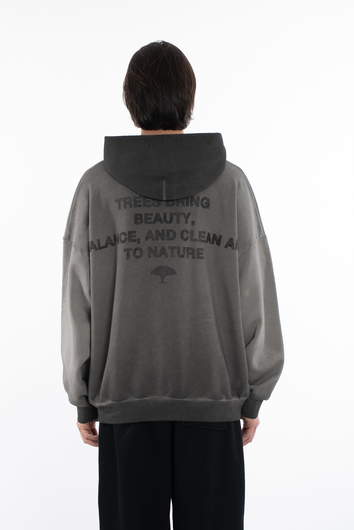 هودي بلون رمادي فنتج بتدرجات جميلة، مميز بطباعة جانبية ناعمة تحمل عبارة مستوحاة من الطبيعة، مع شعار صغير يعطي قطعة الهودي طابع خاص ولمسة راقية.